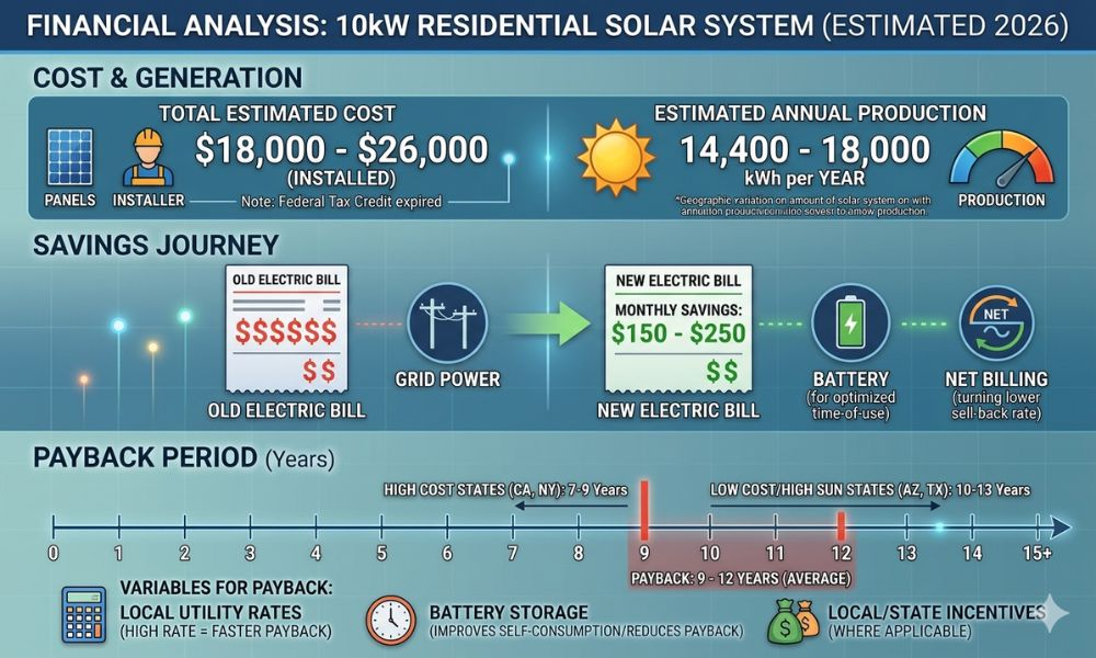It is also important to note that total investment for a 10kW system typically ranges between PKR 1,100,000 and 1,200,000, depending on component quality and battery inclusion.