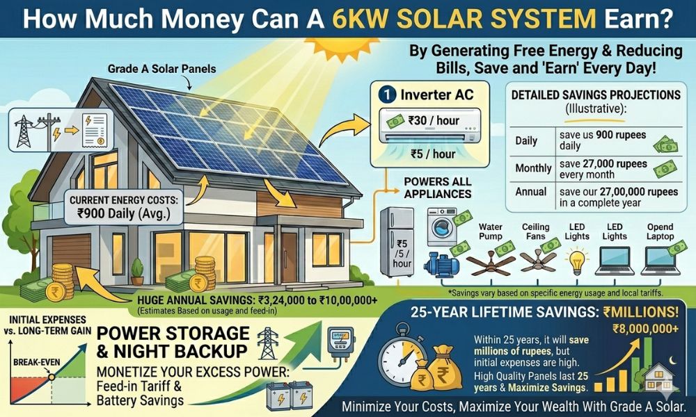 A 6 kW solar system can save us 900 rupees daily and 27,000 rupees every month by generating free energy from sunlight at no cost. This small solar system will save our 27,00,000 rupees in a complete year by installing it at home.