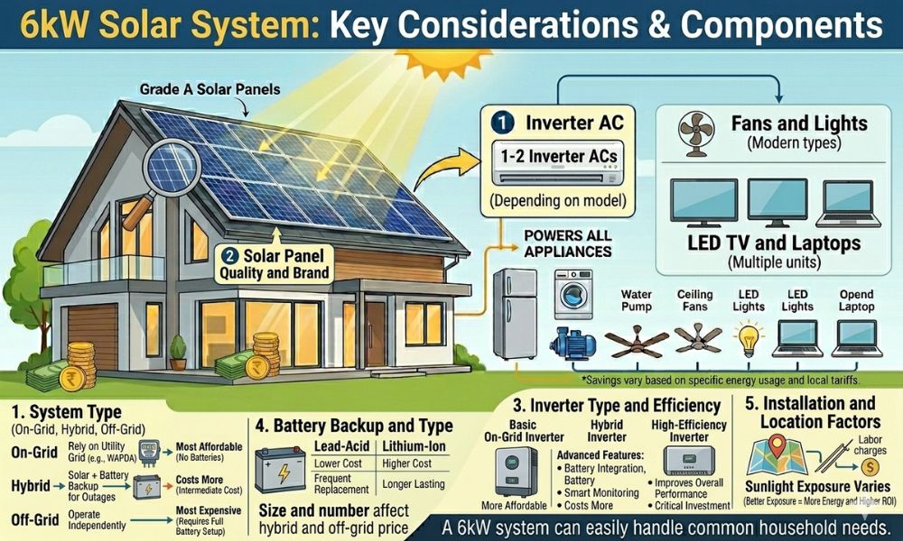 Solar panels are the most important and costly component of a 6kW system. High-quality Tier-1 panels offer better efficiency, durability, and longer warranties, but they come at a higher price. Cheaper panels may reduce initial cost but can lead to lower performance and faster degradation over time. Investing in reliable brands ensures better energy production and long-term savings.